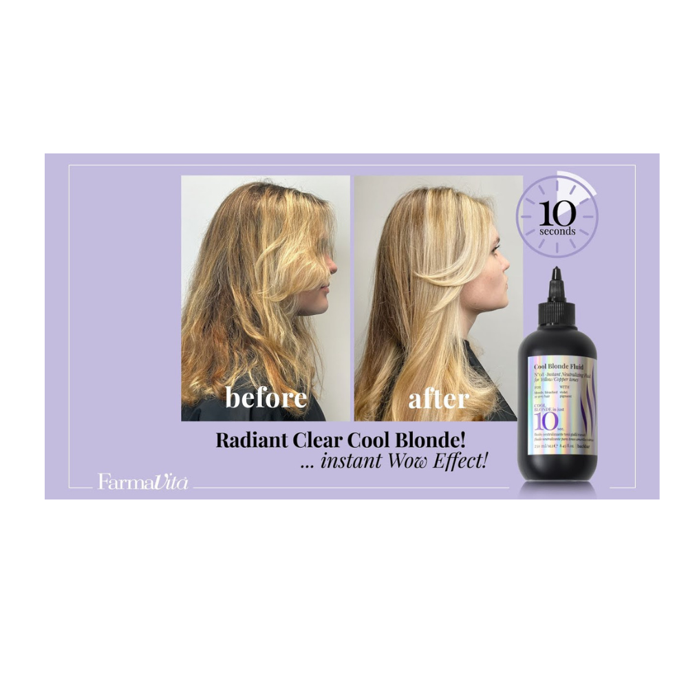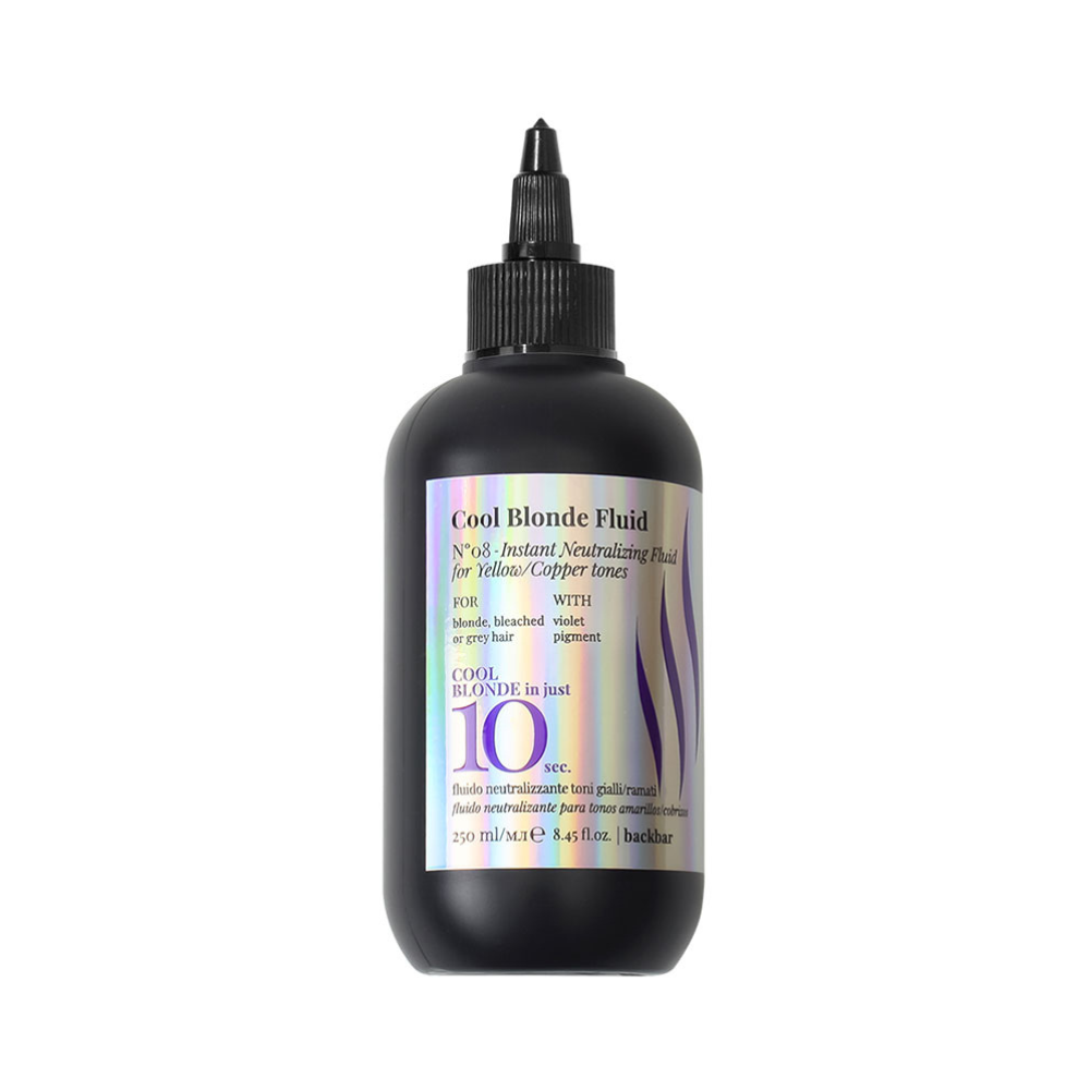 Farmavita Back Bar Cool Blonde Fluid N°08 je profesionálny neutralizačný fluid na žlté a medené odtiene, ktorý zabezpečuje rýchlu a účinnú korekciu blond vlasov. Je ideálny pre blond, zosvetlené aj šedivé vlasy, ktoré potrebujú odstrániť nežiaduce teplé podtóny a získať chladný, čistý odtieň.