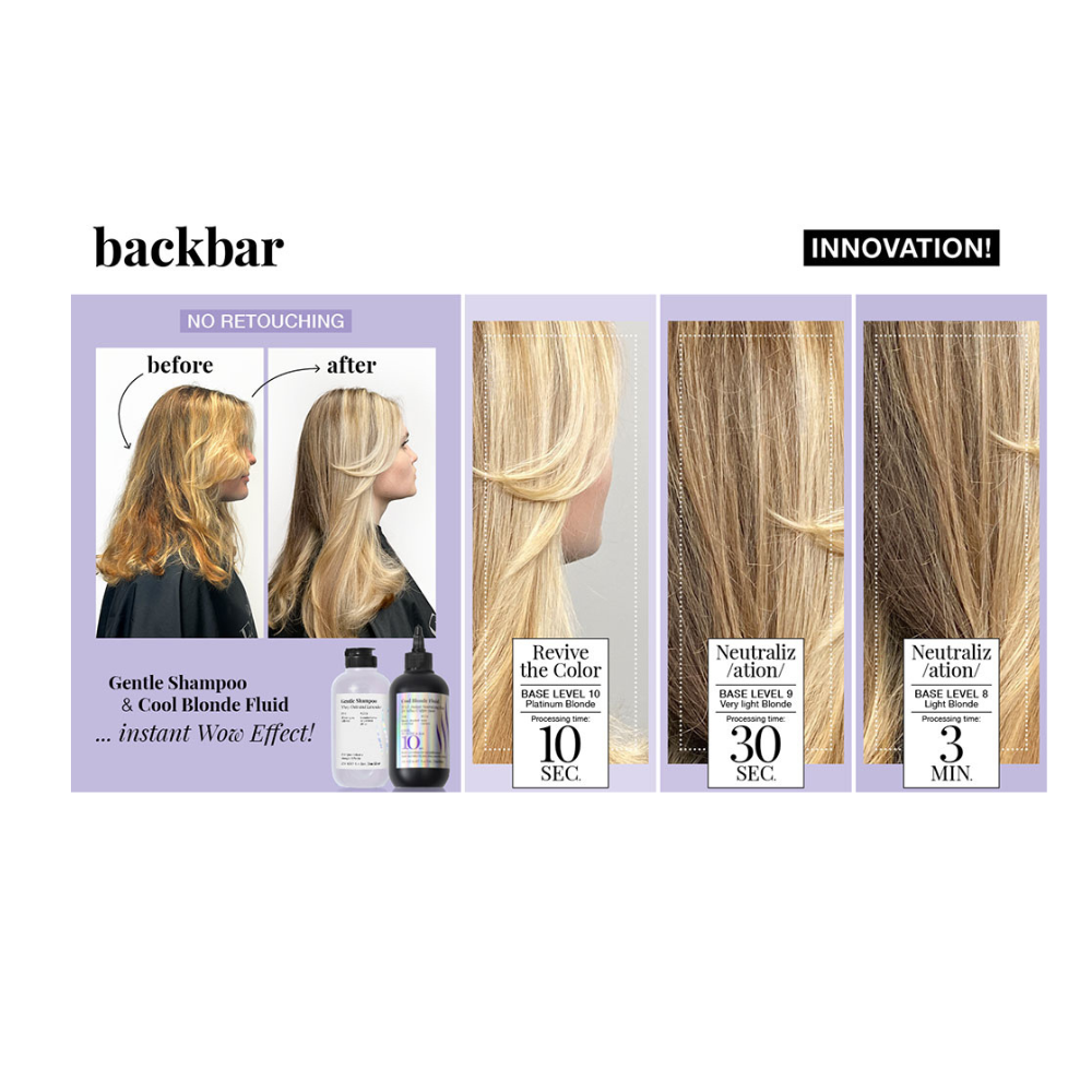 Receptúra obsahuje intenzívne fialové pigmenty, ktoré účinne neutralizujú žlté aj medené podtóny. Tento neutralizačný fluid na žlté a medené odtiene je účinný aj na vlasoch s bázou 8, 9 a 10.